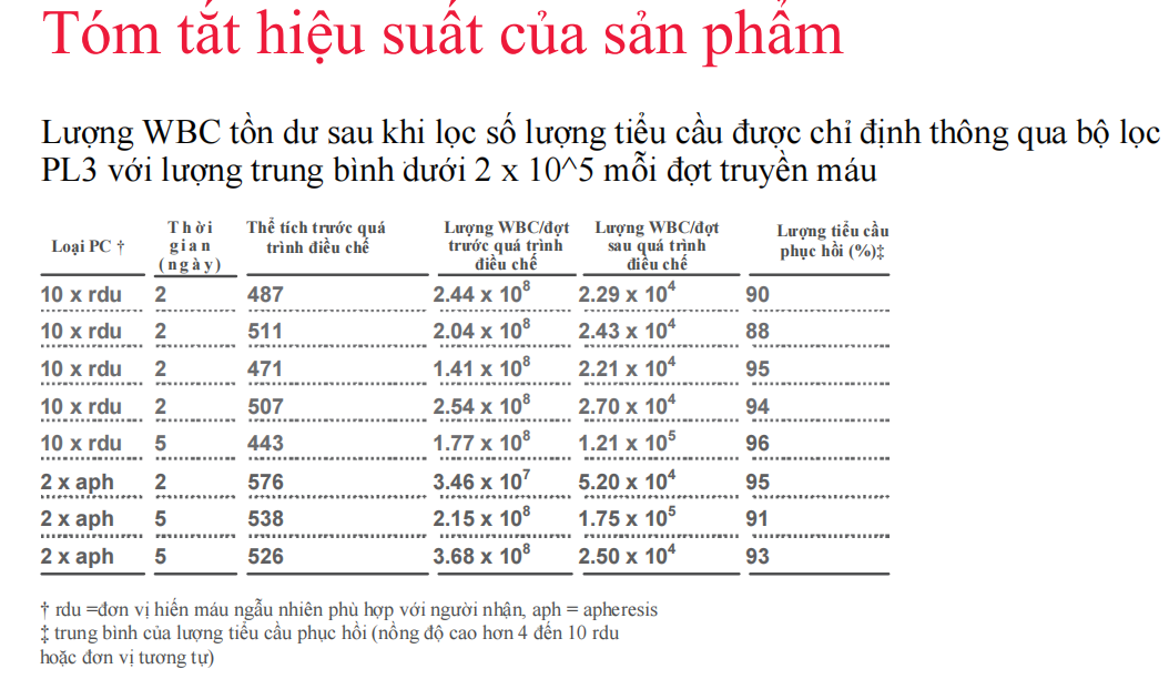 Hiệu quả loại bỏ bạch cầu: Lượng bạch cầu còn tồn đọng trung bình nhỏ hơn 2 x 10^5 khi truyền máu.