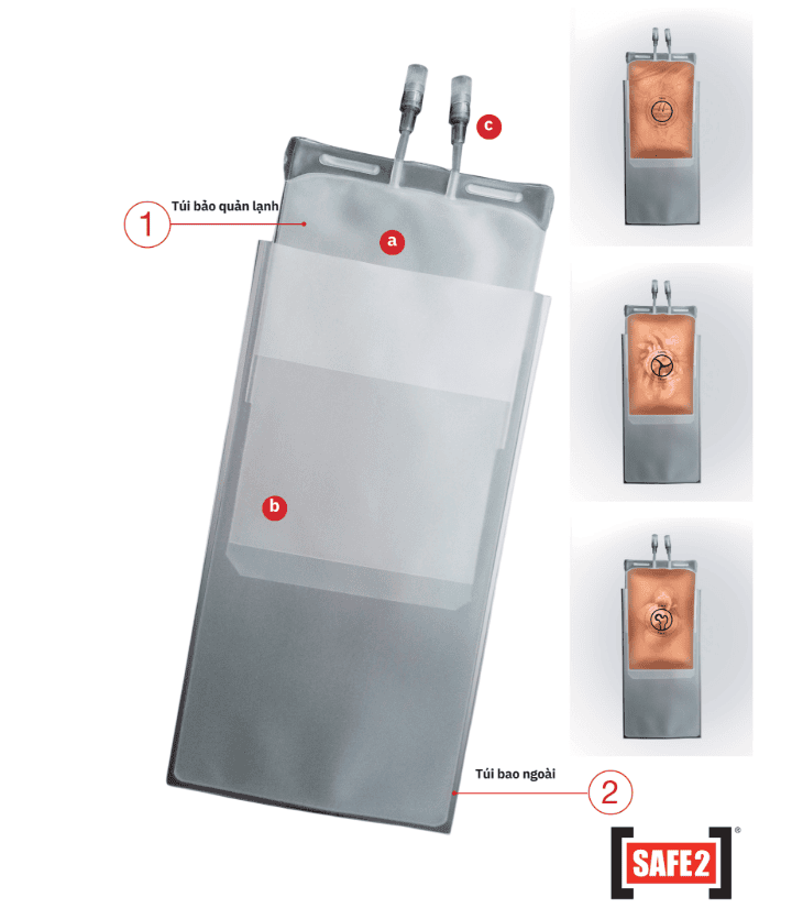 b. Thiết kế túi cho phép dễ dàng đưa các mô (như da, mạch máu, van tim) từ phía mở của túi. Sau khi hàn, có thể thêm dung dịch bảo vệ đông lạnh và/hoặc loại bỏ không khí bằng cách sử dụng các đầu nối không có kim.