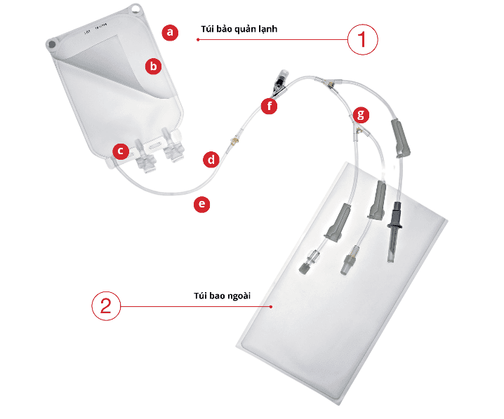 b. Một lớp bổ sung (lemb) được gắn ở đáy túi. Nó cho phép dán nhãn, chứa tất cả thông tin theo yêu cầu (ISBT128) và ngăn ngừa nguy cơ nhiễm bẩn các thành phần có khả năng kết dính, như keo, bên trong túi.